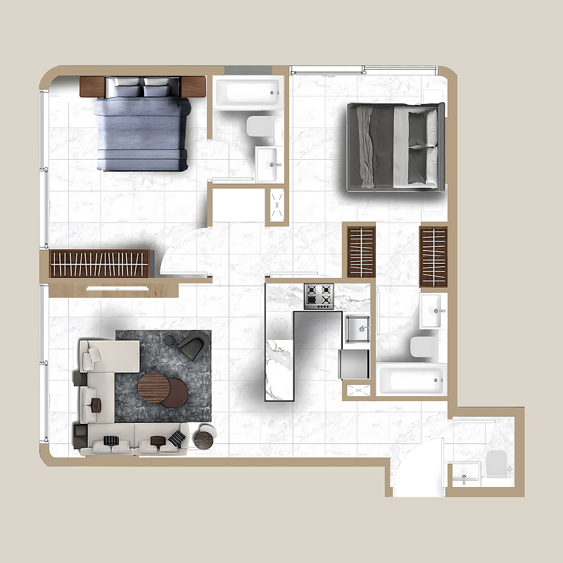 A belső terekben a teljesen berendezett okos apartmanok prémium kivitelezésűek, elegáns elrendezéssel és csúcsminőségű konyhai gépekkel rendelkeznek, így a stílus és a kényelem könnyed kombinációját teremtik. Gondosan megtervezett terek szolgálják a modern életstílusokat, biztosítva a magánszférát és a barátságos légkört, így ideálisak családok és szakemberek számára egyaránt.