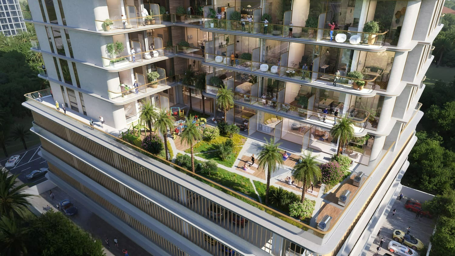 A lakók exkluzív szolgáltatások széles választékát élvezhetik, beleértve egy végtelenített medencét panorámás városi és naplemente kilátással, egy korszerű edzőtermet, jakuzzit, szaunát, valamint dedikált területeket jógához, sporthoz és grillezési összejövetelekhez. A családok számára külön medencék állnak rendelkezésre felnőttek és gyermekek számára, valamint játszóterek, mindez a vásárlási lehetőségek, iskolák, kórházak és parkok közelségében, biztosítva, hogy minden igény kielégüljön ezen a vibráló helyszínen.
