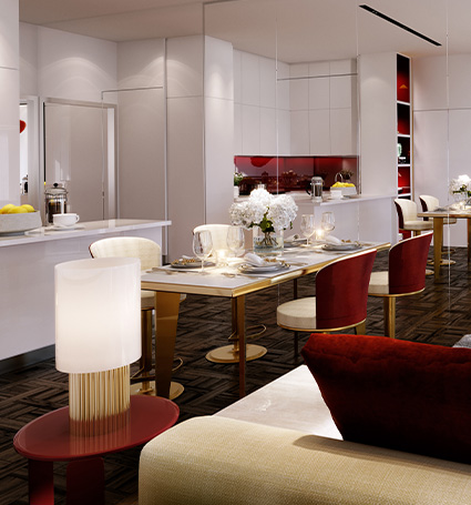 A de Grisogono Signature rubinjai és a véletlen, izgalom és maga az élet színe ihlette. A torony lenyűgöző skarlátvörös árnyalatokkal büszkélkedik, kezdve a csodálatos előcsarnok bejáratától egészen a belső részletekig és bútorokig. Egyedi tervezése, amely egy csiszolt gyémántot utánoz, kilométerekről is azonnal felismerhető. Minden luxuslakás kifogástalan átalakítható élettereket használ, mozgatható falakkal, amelyek teljes rugalmasságot biztosítanak otthonában.